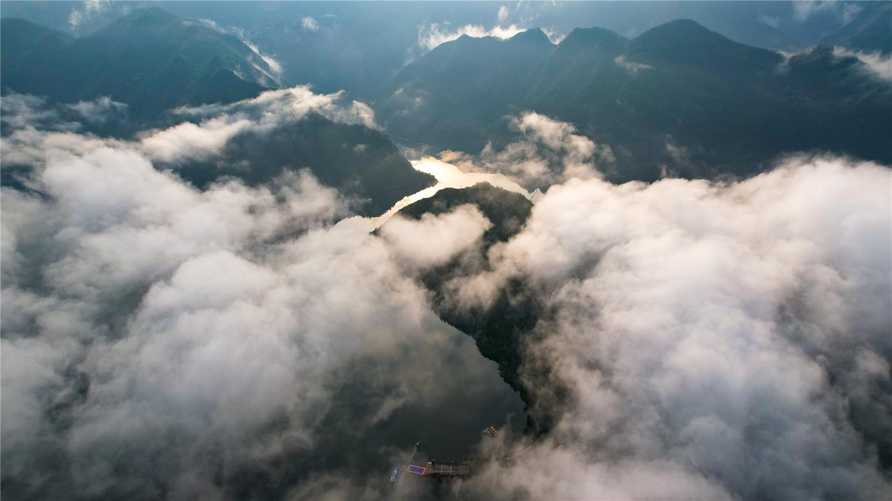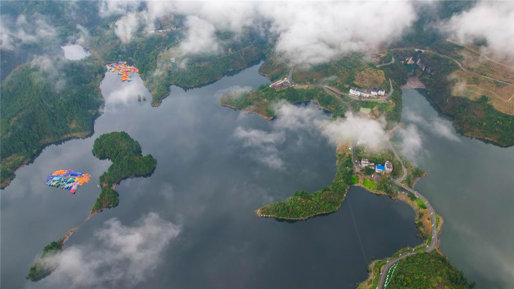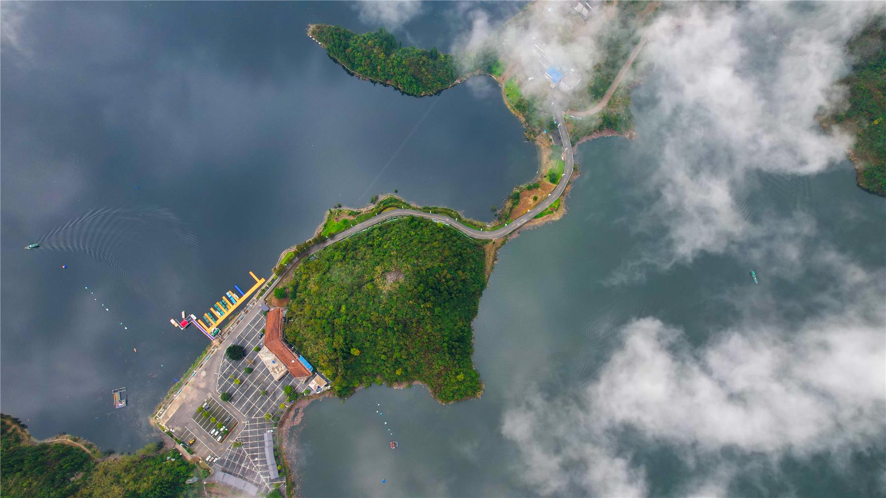 從空中俯瞰,兩岸青山如黛,一湖碧水如鏡。云霧飄渺,湖泊、山丘、村莊在云海中若隱若現(xiàn),宛如畫卷,美不勝收。湖作青羅帶,生態(tài)優(yōu)美的清水湖如一條青綠色的綢帶,云霧鋪展在碧綠的湖面上,云起云落間,恍若給清水湖蒙上了一層朦朧的“面紗”。輕盈的薄霧蕩漾在湖面上,一葉扁舟駛過,在江心劃過一道白線,霧鎖深山,水清岸綠,舟行碧波上,人在畫中游。