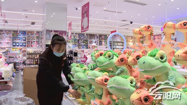 在恐龍博物館門(mén)口,工人們正將第1批2000只龍寶乖妹進(jìn)行下貨入庫(kù),隨后將物品分類(lèi)發(fā)放到各個(gè)飾品店。在飾品店內(nèi),工作人員在店鋪顯眼的位置,擺放和整理著“龍寶”和“乖妹”,為25號(hào)的正式售賣(mài)做好準(zhǔn)備。