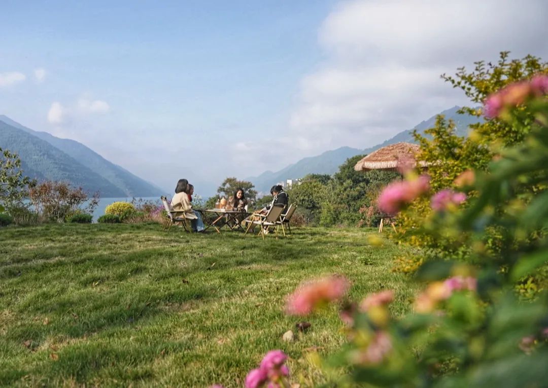 游客們或漫步賞景,或休憩小住