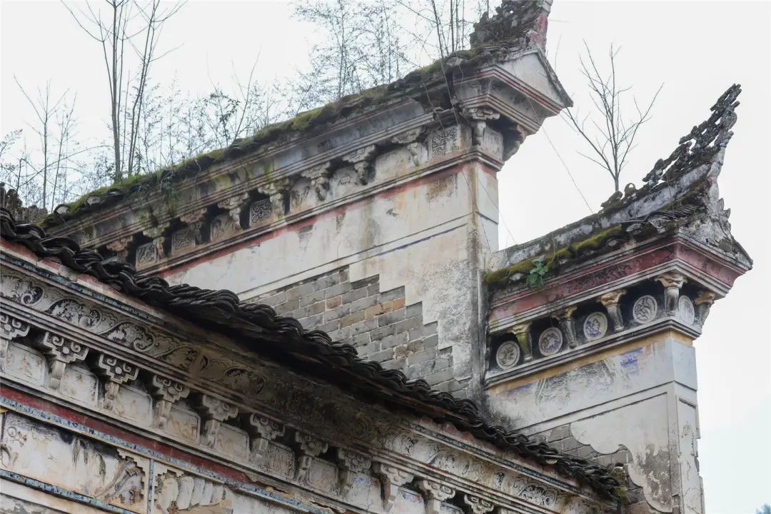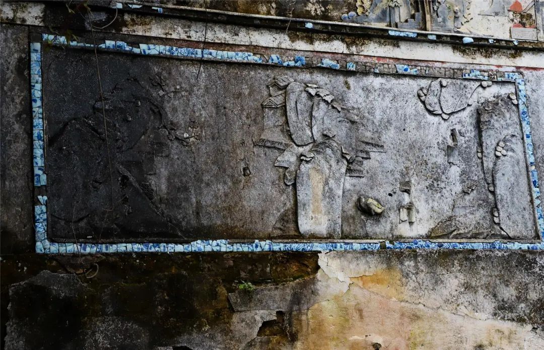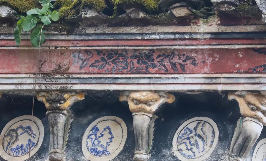古宅的門樓檐腳,很是講究,用精美的石雕作裝飾。門樓橫坊上,刻有雄獅雕飾,形象生動。門樓石墻的頂端布滿了彩繪、灰塑,部分墻面采用了碎青釉瓷片作裝點(diǎn)。細(xì)看門樓頂部的磚雕,串聯(lián)著30余幅畫像,有人物、花卉、山水等。