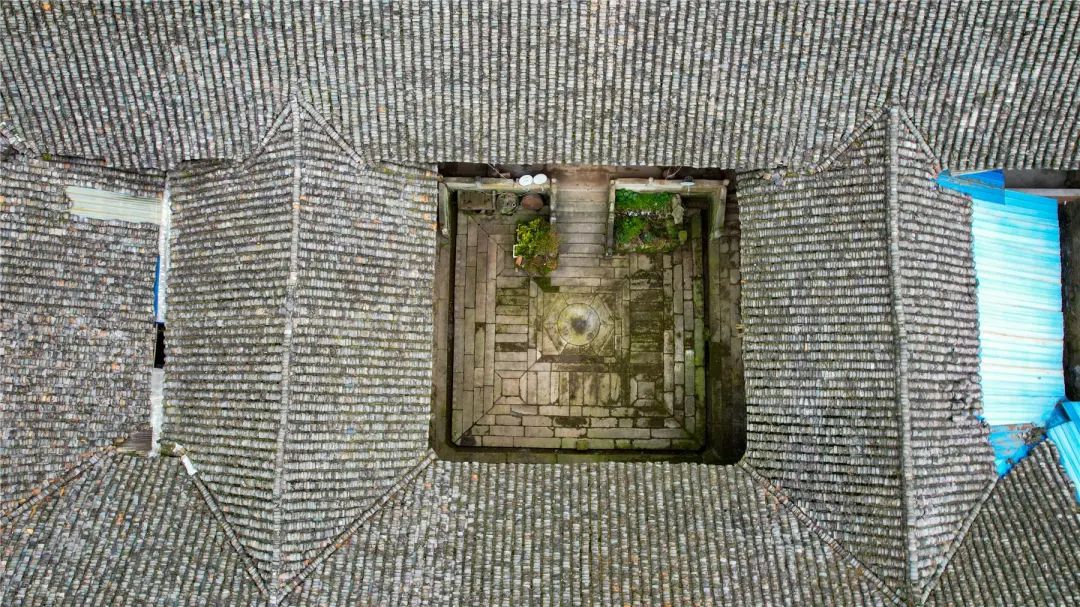 進(jìn)入古宅,八卦形石板鋪在正中,雕花木扇迎面而設(shè)。開敞式天井下,設(shè)有四方排水溝渠。可以想象,院內(nèi)雨水不流向屋外,順勢納入天井之中。