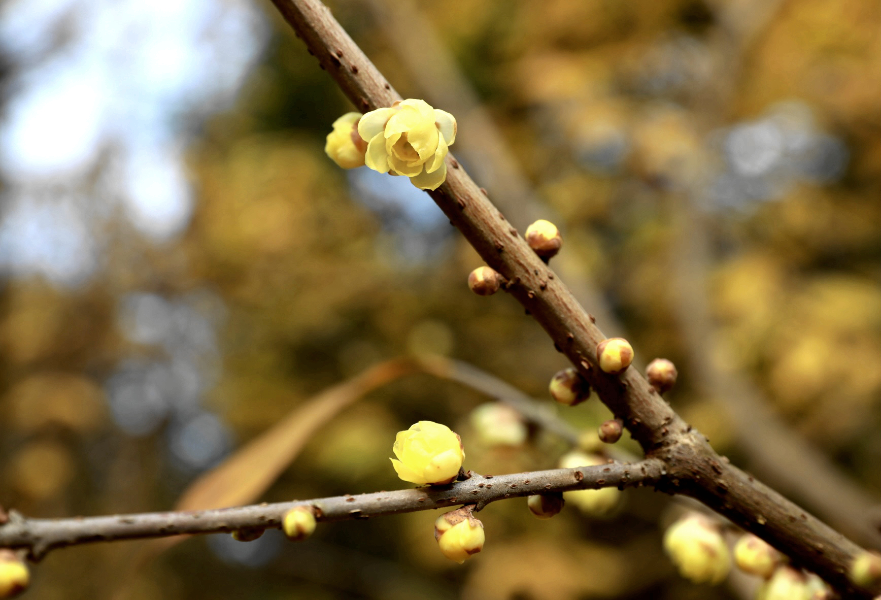 走進(jìn)云頂公園,未見其花,先聞其香。遠(yuǎn)遠(yuǎn)望去,枝條交錯,顆粒似的點綴其上。循著花香慢慢走近,才看清這臘梅花的“真面目”,嫩黃色花瓣緊密層疊,潤澤透明,圍繞著花蕊呈壇狀開放,花形精致小巧,立于枝條上,緊挨著的還有尚待開放的花苞,豆粒般大小,底端呈褐色,頂端則呈淺黃色,似是要在這寒冷冬日,沖破束縛,傲然盛放。