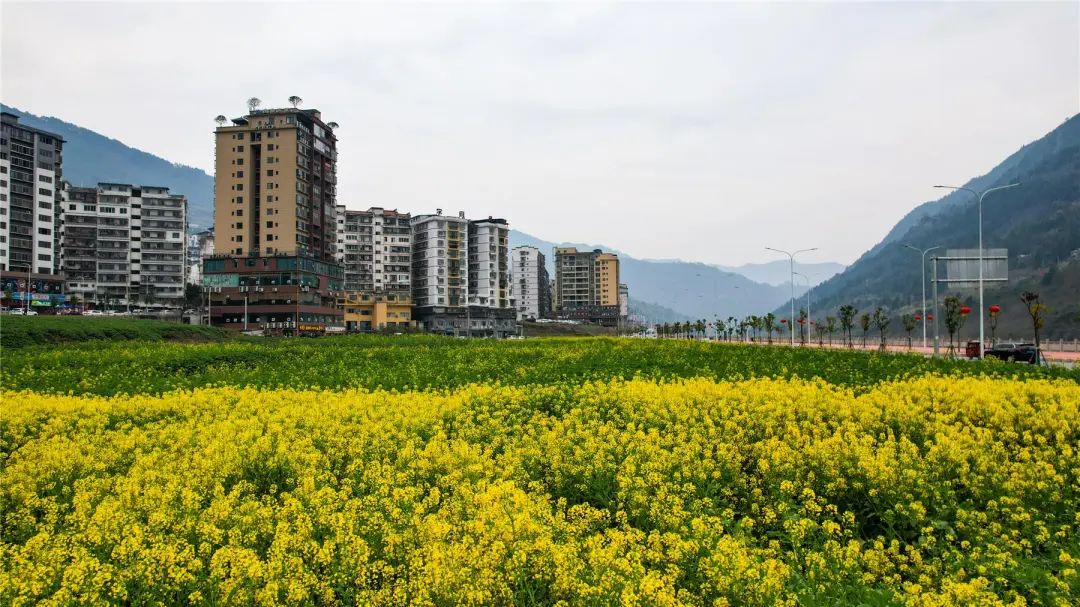 金黃色的油菜花還與場(chǎng)鎮(zhèn)的高樓