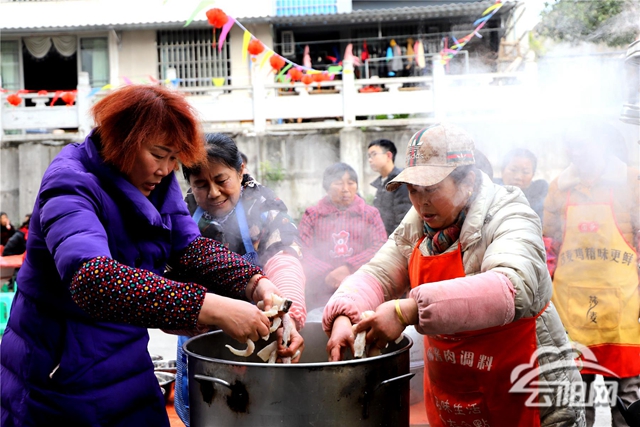 一大早,亮水坪社區(qū)內(nèi)一片忙碌歡樂的景象,喜慶的音樂、火紅的燈籠,到處充滿著濃濃的年味?;馉t旁,廚師已經(jīng)開始準(zhǔn)備團(tuán)年飯的菜肴,紅燒牛肉、燒白、麻辣魚、魔芋燒雞......在廚師的巧手下,這些菜肴或蒸、或炸、或炒,不一會便飄出了香味。上午11:30,居民們舉杯歡慶,享受美味佳肴,共迎新春。