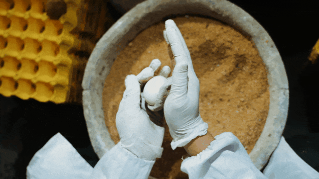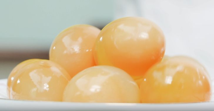 這段時(shí)間,袁廷明正忙著趕制訂單,緊盯生產(chǎn)進(jìn)度。和別家不一樣,袁廷明工廠里生產(chǎn)的皮蛋,保質(zhì)期較短,顏色金黃,無(wú)一絲黑色雜質(zhì)??湛谄穱L,蛋黃香醇濃厚,堿味淡,口感更好。敲掉外衣,剝開(kāi)蛋殼,切開(kāi)后分三圈不同的色彩,外圈金黃透亮結(jié)成晶狀固體,中圈略帶黃色,較軟,里圈呈金黃色,為溶糖狀,稱(chēng)為“糖心蛋”。