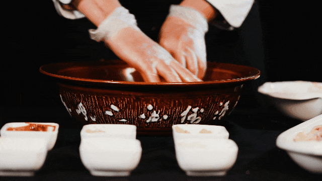 清洗完備的肥腸切片過后就來到腌制環(huán)節(jié),瀝干水分過后,加入米面、鹽、白酒、秘制剁椒醬,緩慢攪拌均勻至米面變成紅色,和肥腸較好融合便可進(jìn)入下一步驟。裝壇的過程急不得,需要一層層鋪墊。取適量鲊肥腸平鋪于罐內(nèi),用手壓緊,曬上一層米面。反復(fù)幾次,將鲊肥腸層層壓實(shí),盡可能排除罐中的空氣。最后扎緊開口,將瓦罐倒置保存。
