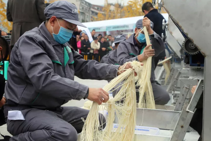 目前,云陽(yáng)從事面條加工的經(jīng)營(yíng)者近20萬(wàn)人,所開(kāi)面坊超過(guò)6萬(wàn)家,遍布全國(guó)200多個(gè)城市,每年創(chuàng)造產(chǎn)值上千億元,加上上游面粉等食品原料交易以及調(diào)料包等配料加工,一根根細(xì)細(xì)的面條已“鏈”成了長(zhǎng)長(zhǎng)的產(chǎn)業(yè)鏈。面條,不僅是云陽(yáng)人舌尖上的寵兒,更是無(wú)數(shù)云陽(yáng)人養(yǎng)家糊口的生計(jì),寄托著他們?cè)鍪罩赂坏膲?mèng)想。