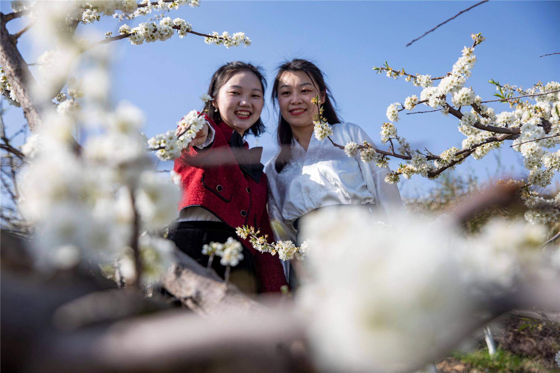 游客在李子園奔跑,拍照,擺出各種姿勢(shì),在花枝下定格自己的瞬間。