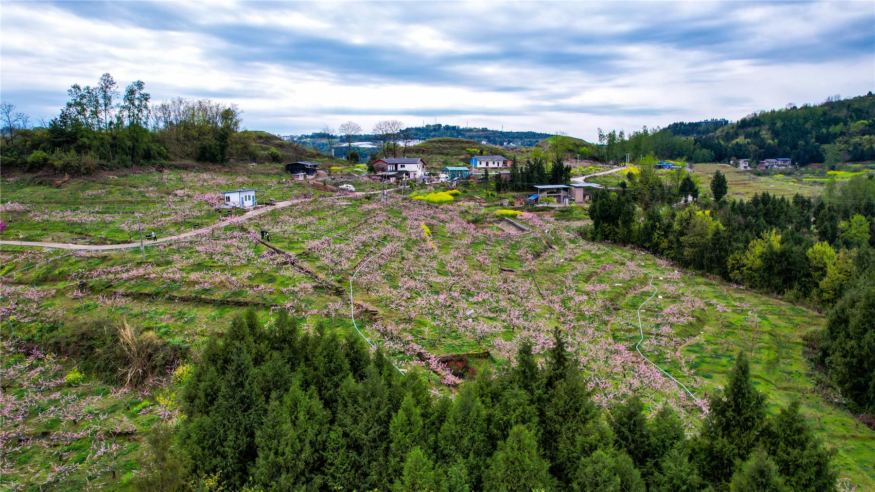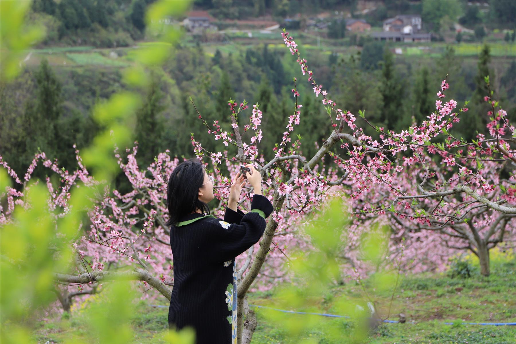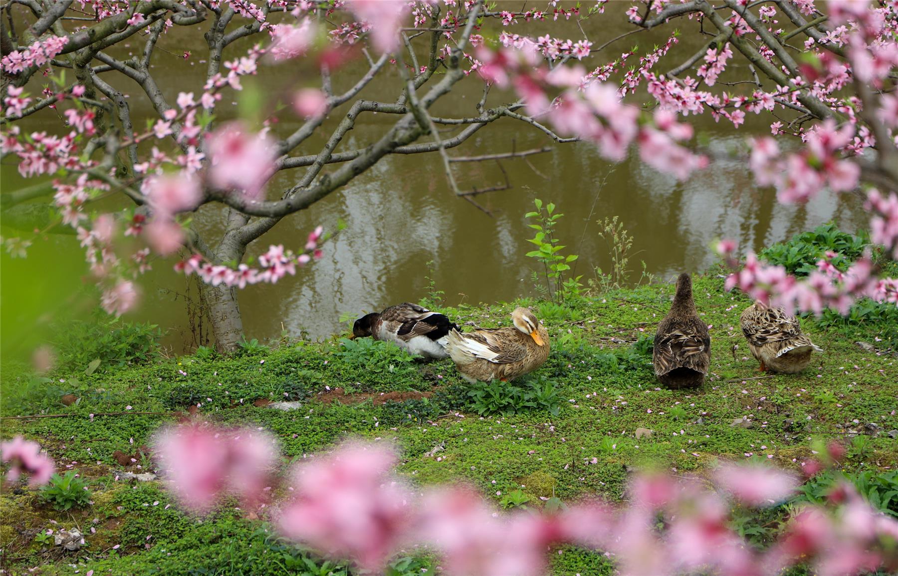 “這一片桃花開得特別好,就像粉色的云朵。旁邊又有池塘,又有鴨子嬉戲,頗有‘竹外桃花三兩枝,春江水暖鴨先知’的意境?!庇慰完愨勒f。