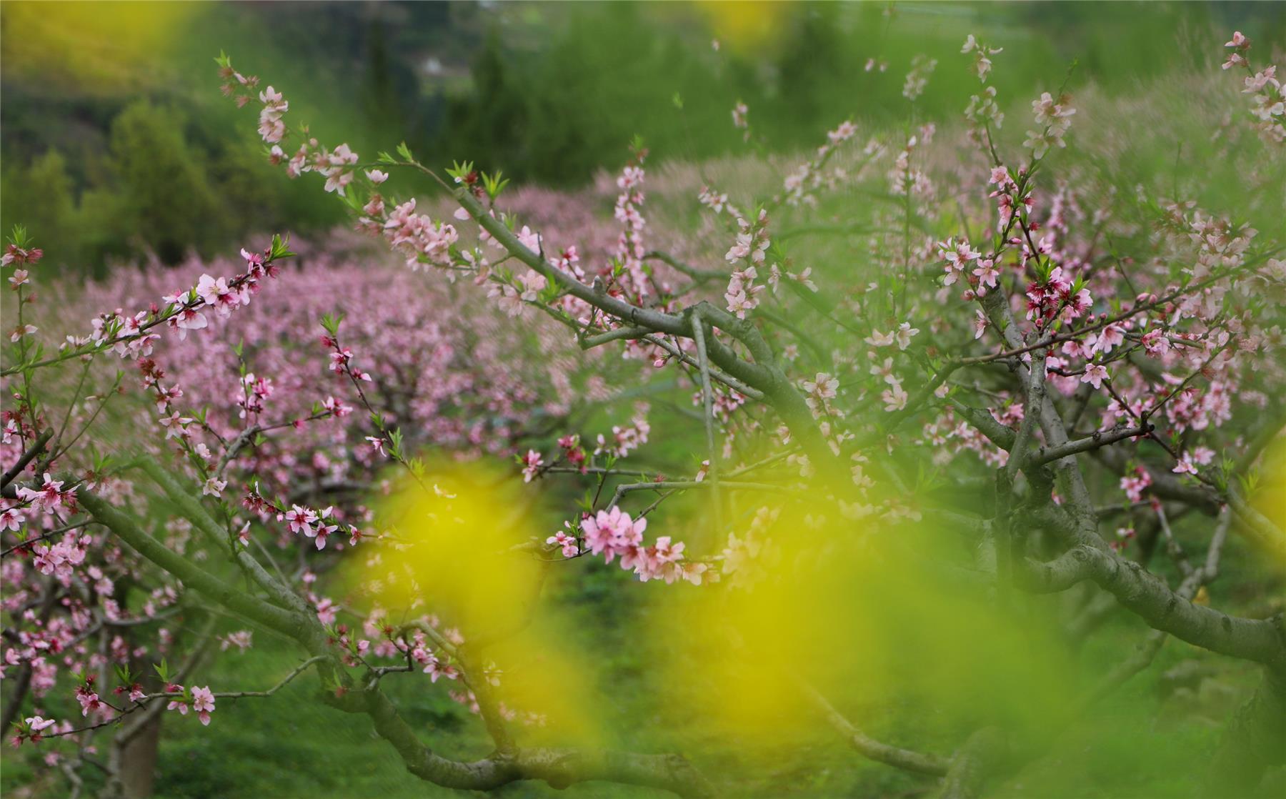 走進(jìn)桃林,浪漫的春日氣息便撲面而來,一樹樹桃花開得爛漫似片片云霞飛落山間。近觀枝頭,朵朵桃花舒展著身姿似佳人嫣然含笑,粉嫩可愛。一陣春風(fēng)拂過,花枝搖曳,花瓣在空中飛舞,令人陶醉。片片桃花與油菜花、池塘、鴨子相映成趣,如詩如畫。