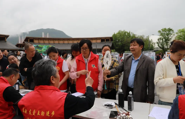 “平常我也比較喜歡讀書,今天特來寫了這幅字,勉勵自己多讀書,讀好書,不斷增長自己的見識?!笔忻裥煜壬贿呎f著一邊展示著書法家剛寫好的字,并對書法家們的作品贊不絕口。