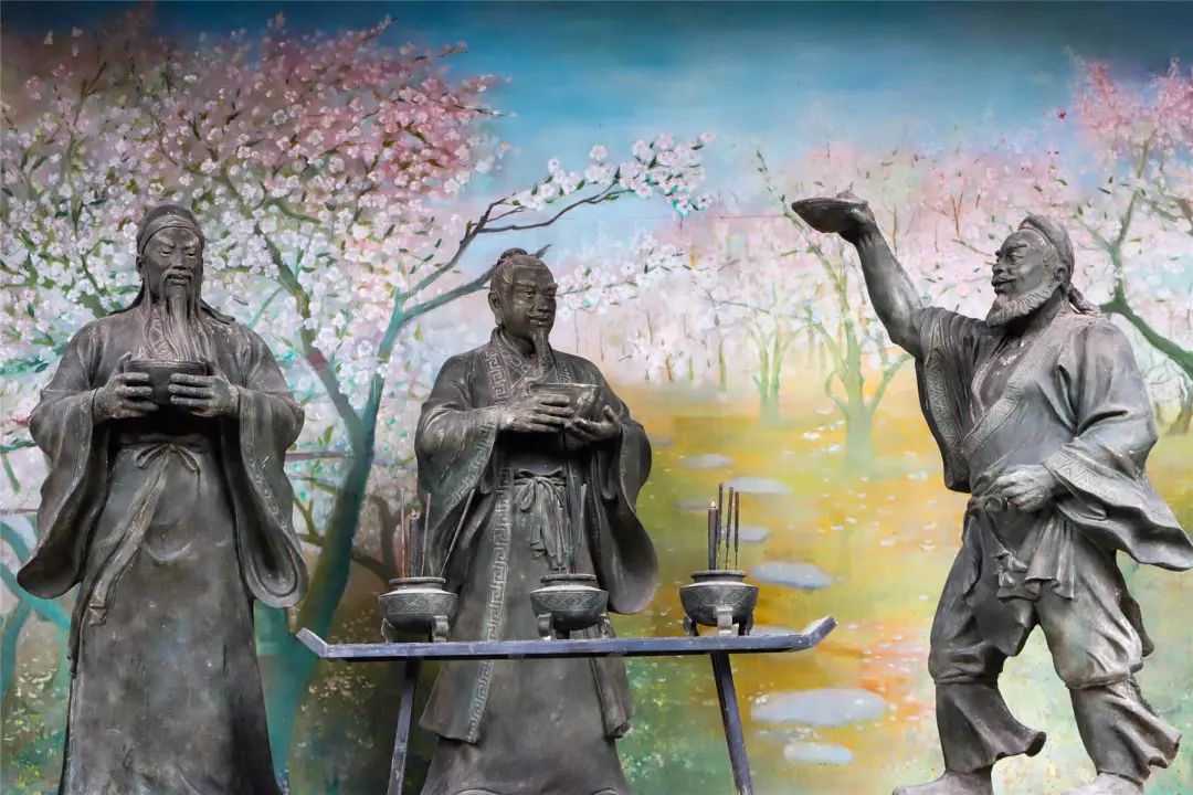 劉、關(guān)、張?zhí)覉@三結(jié)義的雕塑面江而立