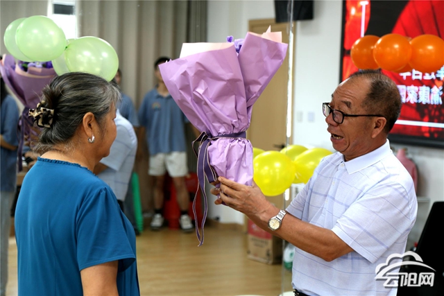 在文藝節(jié)目的間隙,活動(dòng)還特別安排了兩對(duì)金婚夫妻上臺(tái),與在場(chǎng)的所有人共同分享他們相識(shí)、相知、相愛的溫馨故事,隨后丈夫深情地向妻子送上了一束鮮花。