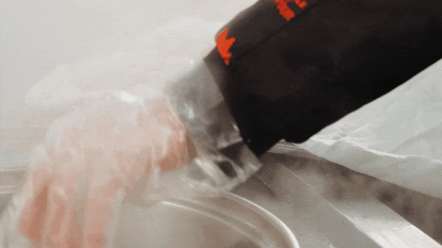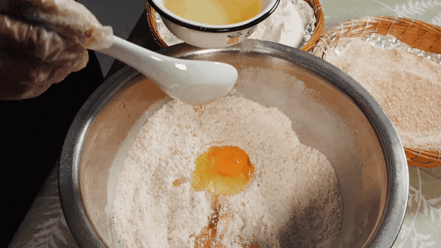 緊接著,便到了重要的制作面皮的環(huán)節(jié)。把未去麩皮的小麥制成的全麥面粉與小麥胚乳制成的精細(xì)面粉按照2:1的比例混合,依次加入適量的雞蛋、油、熱水,和勻后,反復(fù)揉捏成軟糯筋道的面團(tuán),然后將面團(tuán)揉成長條狀,再分成一個(gè)個(gè)小劑子,按平、搟制,靈巧的雙手下,一張張大小厚薄勻稱的面皮便誕生了。