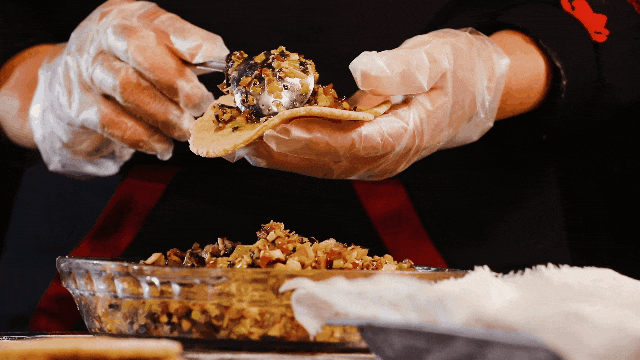 要做成這道美食,餡料、面皮缺一不可。選取自制農(nóng)家風(fēng)味的臘肉,切成丁狀,焯水備用,再將豆干、鹽菜、榨菜、香蔥、大蒜等食材切成細(xì)狀,起火燒油后,與臘肉丁一同翻炒制作成餡料,鍋中滋滋作響、香氣四溢時(shí),便可盛起放涼待用。