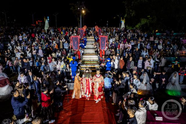 10月5日晚,在云陽(yáng)縣月光草坪一生一世長(zhǎng)廊,行加冠之禮后的“新婿”整裝待發(fā),用八抬大轎的方式迎娶“新婦”。