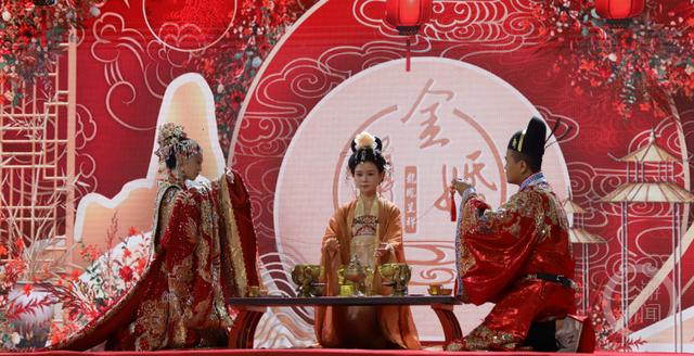 國(guó)潮婚典秀生動(dòng)再現(xiàn)了傳統(tǒng)婚俗文化中梳妝禮、沃盥禮、同牢禮、合巹禮、婚禮、執(zhí)手禮等禮儀環(huán)節(jié),向在場(chǎng)觀眾呈現(xiàn)了一場(chǎng)跨越時(shí)空的婚禮盛宴。