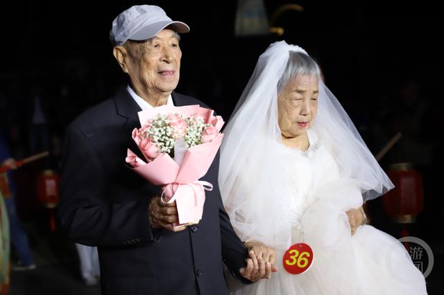 此次國(guó)潮婚典秀,再現(xiàn)中式傳統(tǒng)婚禮風(fēng)貌的同時(shí),也緊密融合了西式婚禮的浪漫元素。30對(duì)金婚夫婦在觀眾的見(jiàn)證下,身著婚紗禮服,手捧鮮花,腳踏紅毯,攜手相伴而行,成為這場(chǎng)集體婚禮上最亮眼的主角,還拿到了民政局為他們準(zhǔn)備的結(jié)婚證書(shū)。