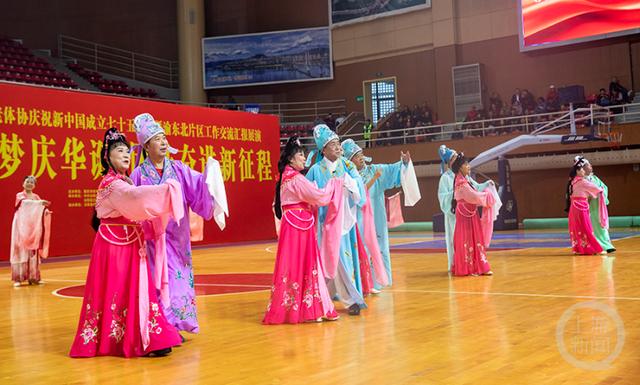 廣場(chǎng)舞《龍騰盛世新云陽(yáng)》拉開(kāi)了活動(dòng)的序幕,大型舞蹈《黃河水從家門(mén)前流過(guò)》《不忘初心》,管樂(lè)大合奏《華誕頌》以及黃梅戲、京劇、太極拳、健身球操、柔力球、彩帶舞等輪番上演,演出現(xiàn)場(chǎng)高潮迭起。