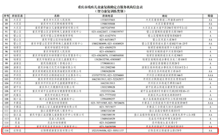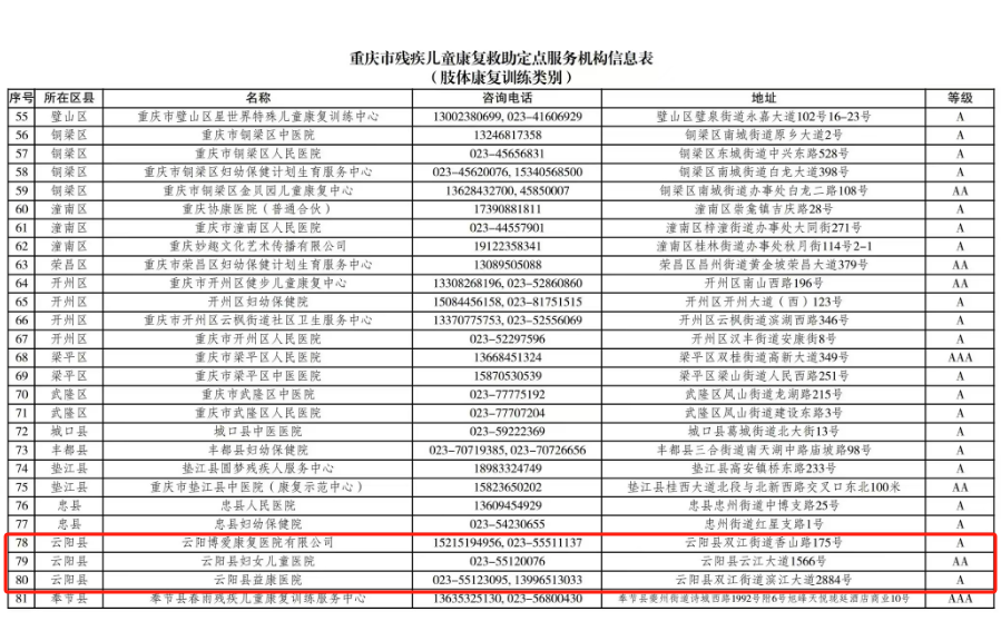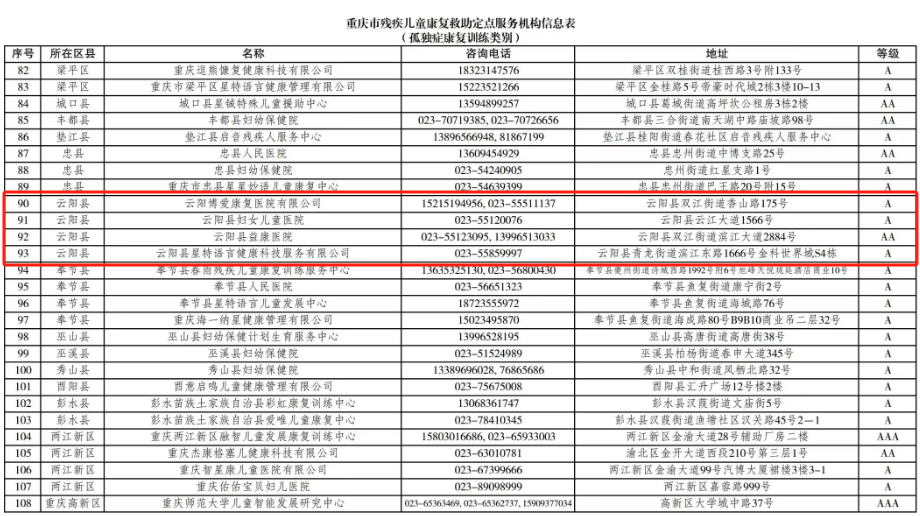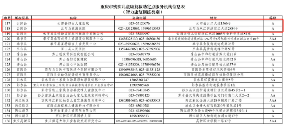 部分重慶市殘疾兒童康復(fù)救助定點(diǎn)服務(wù)機(jī)構(gòu)分類信息表: