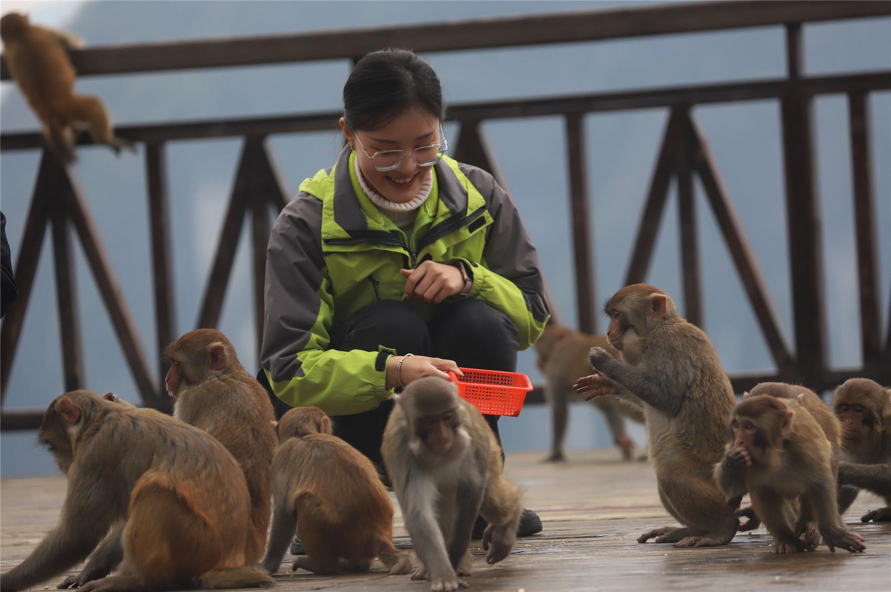 “到了冬天沒有足夠的食物,猴群就從山上轉(zhuǎn)移到了山下,景區(qū)專門安排了專門的飼養(yǎng)人員,設(shè)置了9個不同的投食點,每天投放食物。這樣,猴子就有足夠的食物,安穩(wěn)地度過這個冬天了。”扶泊慶介紹道,就這樣,飼養(yǎng)人員定時喂養(yǎng),成群的猴子每天來此覓食,已經(jīng)成為了景區(qū)內(nèi)一道有趣的風(fēng)景線。