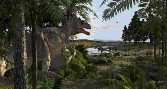 距今2.52~0.66億年中生代自然地貌環(huán)境與現(xiàn)代截然不同,天時地利特別適應(yīng)恐龍生存。地殼劇烈運動在地殼大陸形成諸多山間盆地,河流湖泊星羅棋布,得天獨厚溫床般空間環(huán)境為恐龍家族繁衍生息奠定堅實基礎(chǔ)。全球氣候環(huán)境溫暖潮濕,極地和赤道溫差較小,水杉、蘇鐵、松柏、銀杏、懸鈴木等喜溫森林植物茂盛,古樹參天,叢林密布,為食素恐龍?zhí)峁┰丛床粩嗟摹凹Z食資源”。專家推測恐龍食物量相當(dāng)大,一頭30噸重蜥腳類素食恐龍,日進食2噸。中生代煤炭資源廣泛分布,印證彼時高大喬木生長環(huán)境。上個世紀80年代加拿大地質(zhì)學(xué)家在北極圈埃爾斯米爾島發(fā)現(xiàn)一片以水杉為主樹林以及鱷等化石,說明極地具熱帶氣候環(huán)境。