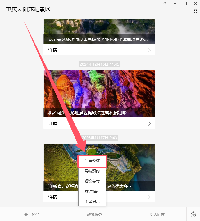 關(guān)注“重慶云陽龍缸景區(qū)”公眾號,進(jìn)入主頁后,選擇【旅游服務(wù)】→【門票預(yù)約】