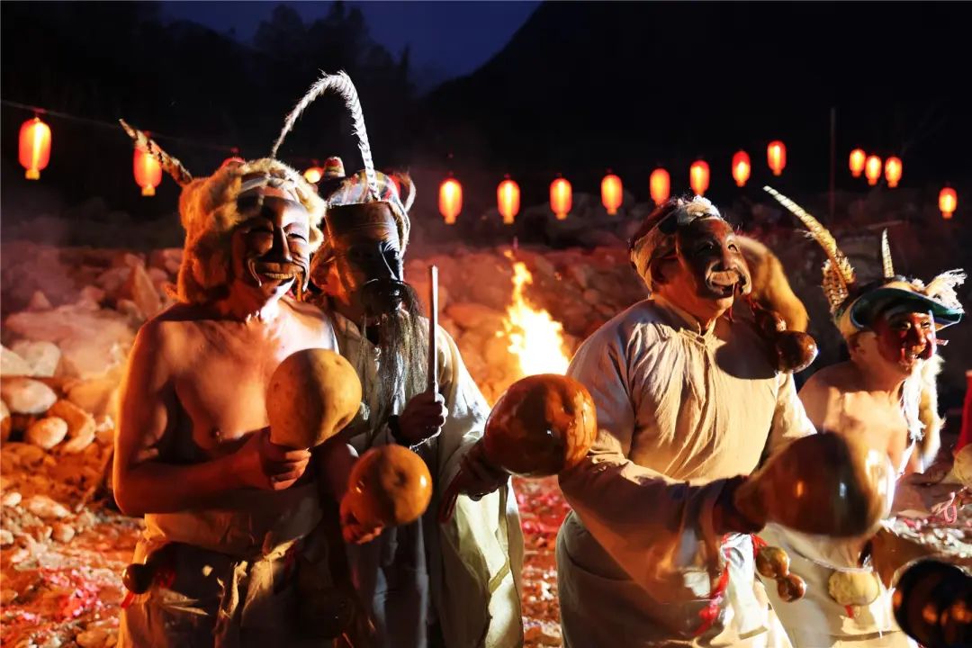 夜幕降臨,色彩斑斕的儺戲演員們身著傳統(tǒng)服飾,佩戴形狀各異的面具,在熊熊燃燒的火堆映照下,踏著強烈的鼓點,伴隨著戲文朗誦與舞蹈,演繹著千年傳承的神秘儀式,展現出威嚴而震撼的場面。