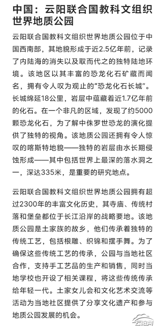 聯(lián)合國教科文組織官網(wǎng)報道云陽世界地質公園