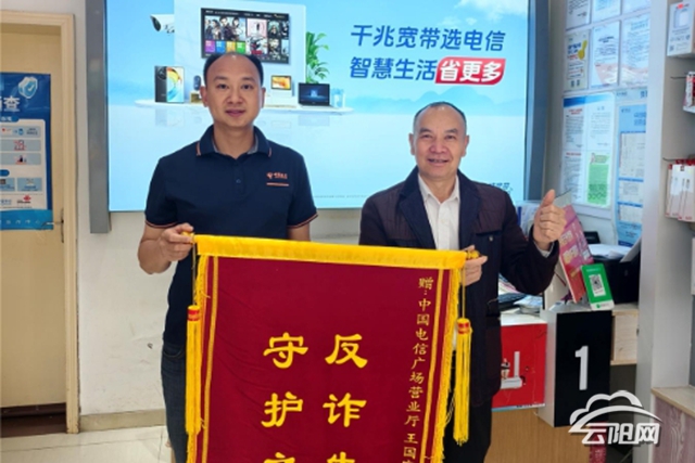 云陽(yáng)網(wǎng)訊(通訊員 余靜 黃雷)近日,云陽(yáng)縣一名群眾將一面印有“反詐先鋒 守護(hù)之神”的錦旗,送到了中國(guó)電信棲霞支局門店老板王國(guó)富的手中。