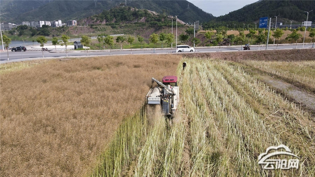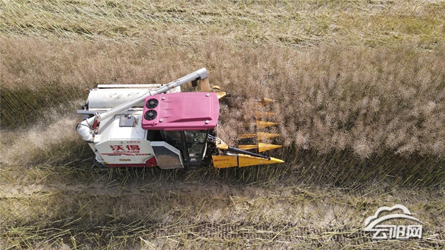 在南溪鎮(zhèn)濱河路油菜基地,一幅現(xiàn)代化的豐收?qǐng)D景正徐徐展開。一株株油菜被飽滿的菜籽壓彎了腰,油菜收割機(jī)在田間來(lái)回穿梭,伴隨著機(jī)器的轟鳴聲,收割、脫粒、秸稈粉碎等工序一氣呵成,成熟的油菜盡收“機(jī)囊”。