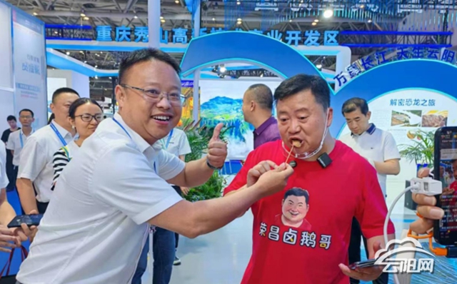 云陽網(wǎng)訊(記者 謝添)5月22日,第七屆中國西部國際投資貿(mào)易洽談會現(xiàn)場,榮昌“鹵鵝哥”與云陽特色美食來了一場精彩“邂逅”。在云陽展館內(nèi),“鹵鵝哥”興致勃勃地品嘗了云陽早面、桃園雞、云安羊雜等地道美食,對云陽美食的獨(dú)特風(fēng)味贊不絕口?,F(xiàn)場工作人員熱情“投喂”桃園雞的歡樂互動,更引得圍觀群眾笑聲連連。