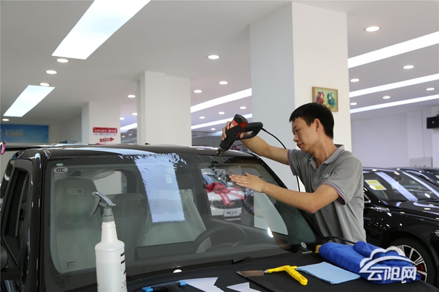 在城區(qū)吉利汽車(chē)門(mén)店,工作人員手持刮板、噴壺等專(zhuān)業(yè)工具,熟練完成裁切、噴液、貼合、除氣泡等工序,確保防曬膜與車(chē)窗完美貼合。