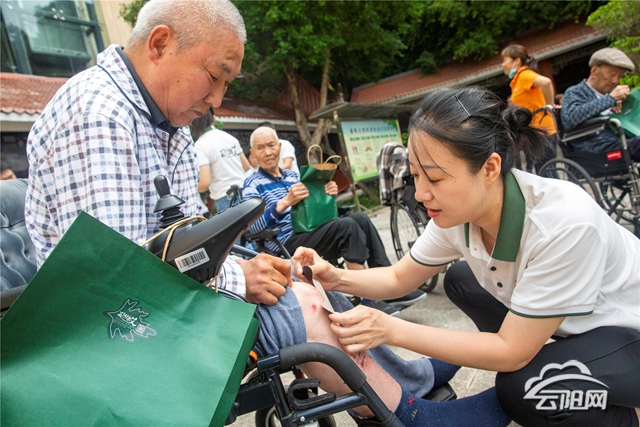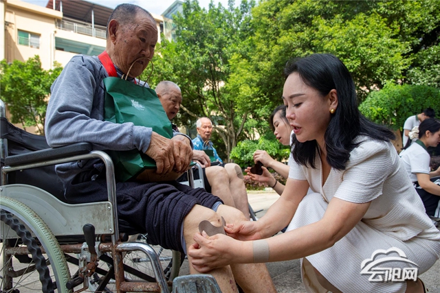 活動中,2025年獲評全國勞模的徐靖雯用樸實真摯的語言,結合自身經(jīng)歷,分享了服務社會、奉獻愛心的感人事跡。專業(yè)講師余長江則聚焦老年人夏季養(yǎng)生需求,以“夏季艾灸養(yǎng)生與常見病預防”為主題,通過圖文講解和現(xiàn)場演示,傳授實用的健康知識。隨后,由中醫(yī)專家和艾灸師組成的專業(yè)志愿者團隊,針對院內(nèi)30余名老人普遍存在的關節(jié)疼痛、腰椎不適等常見問題,提供了一對一的艾灸理療服務,細致入微地進行精準調(diào)理。
