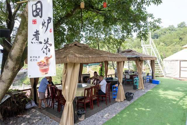 居民們攜家?guī)Э?,或鋪開吊床在草坪邊納涼,或搬著凳子搶占橋頭“雅座”喝茶聊天。