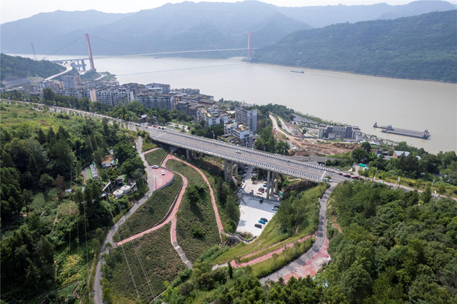 梨樹坡大橋位于復(fù)興社區(qū)二組,復(fù)興場鎮(zhèn)后方,距云陽縣城僅3公里。2022年,隨著146米長的內(nèi)環(huán)大道高架橋在此建成通車,昔日的荒坡迎來蝶變。當(dāng)?shù)卣擅罾脴蛳驴臻g及周邊坡地,因地制宜修建了游步道、停車場、健身場地,并種植花草,將其打造成一個功能齊全的濱江小游園。
