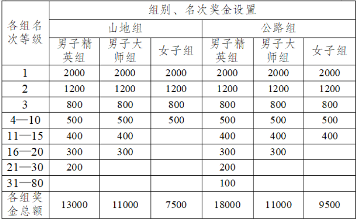 1. 各組別參賽運動員按照到達終點的順序排定名次,分別獲得相應獎金。如果出現(xiàn)并列名次的,則按照并列名次錄取,且不再設置下一名次;稅前獎金設置(單位:人民幣/元):