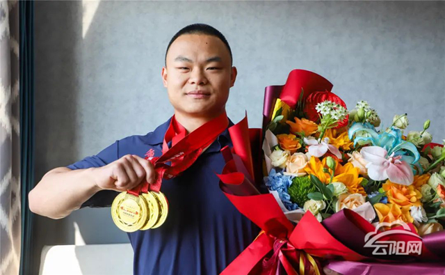云陽網(wǎng)訊(記者 譚啟云 唐彬)今年7月,安徽滁州。在全國U系列舉重冠軍賽的舉重臺上,18歲的丁彬深吸一口氣,發(fā)力,提拉,上挺!杠鈴穩(wěn)穩(wěn)舉過頭頂。當(dāng)電子屏亮起三盞白燈時(shí),他攥緊拳頭猛捶胸膛,汗水混著淚水砸落在臺上——180公斤!最終他以抓舉140公斤、挺舉180公斤、總成績320公斤的絕對優(yōu)勢,斬獲三金。而就在兩個(gè)月前的全國青年錦標(biāo)賽上,他更是舉起了打破個(gè)人極限的182公斤,一舉奪得挺舉項(xiàng)目冠軍。
