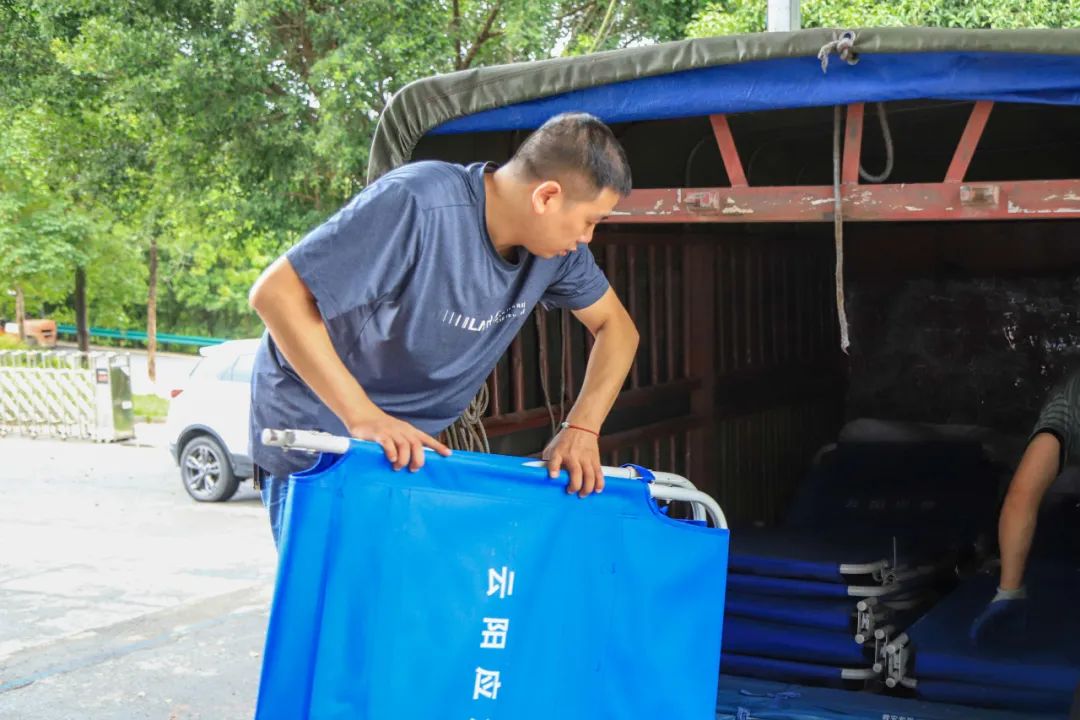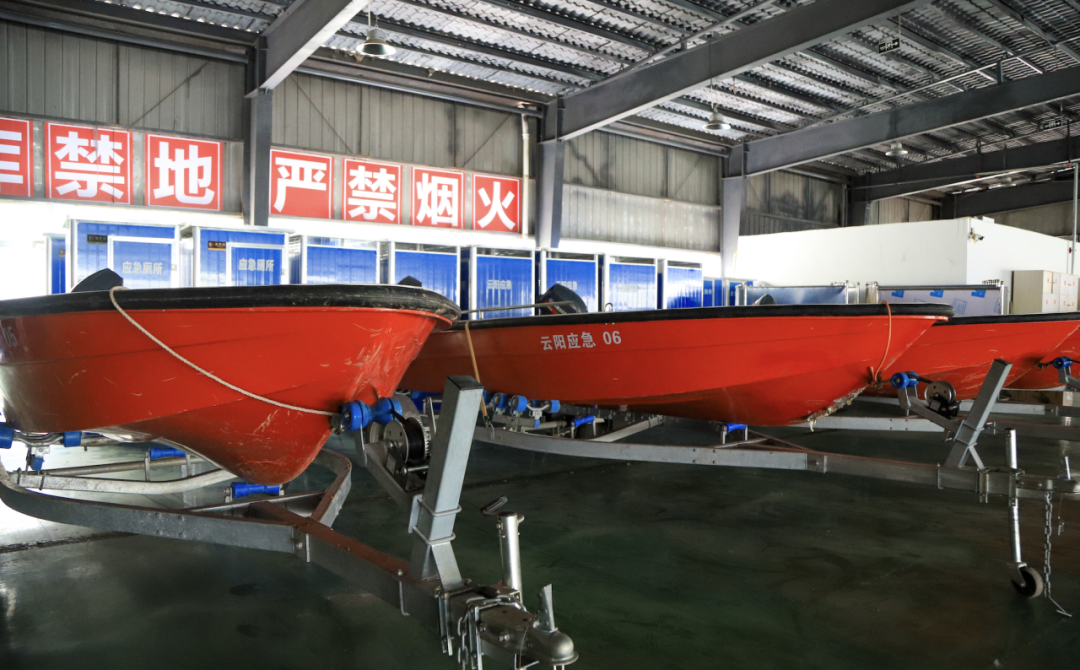 沖鋒舟、編織袋、發(fā)電機等防汛物資整齊碼放
