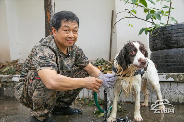 相較“二奎”,“黑豆”耐力更強,訓練中也更顯沉穩(wěn)。但或許是與史賓格犬長期相處,靳忠心底更偏愛略帶“慵懶”氣質(zhì)的“二奎”。烈日當空,“二奎”訓練片刻便吐出舌頭喘息。靳忠拿起水管試好水溫,細心為它沖洗?!笆焚e格犬比較聰明,就是愛掉毛,得常打理?!闭f話間,“二奎”親昵地舔了舔靳忠的臉頰,他眼角彎起,笑意如月。