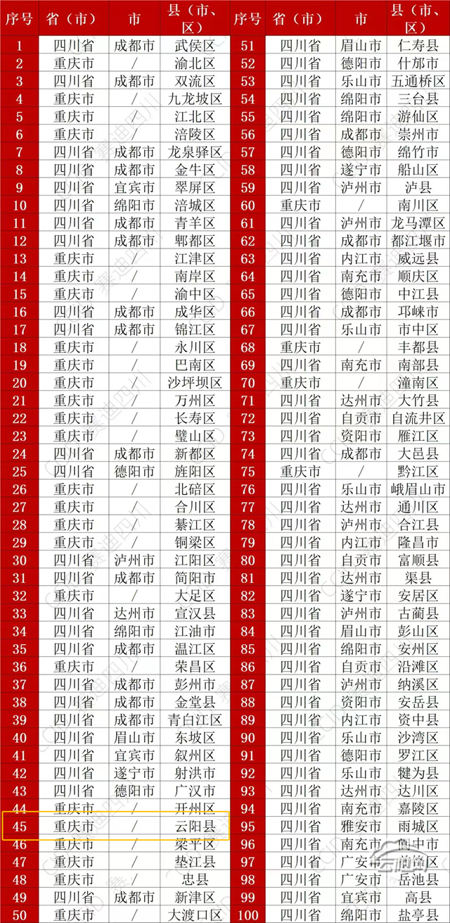 成渝地區(qū)雙城經(jīng)濟(jì)圈高質(zhì)量發(fā)展指數(shù)前100區(qū)縣