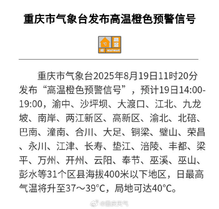 重慶市氣象臺發(fā)布高溫橙色預警信號