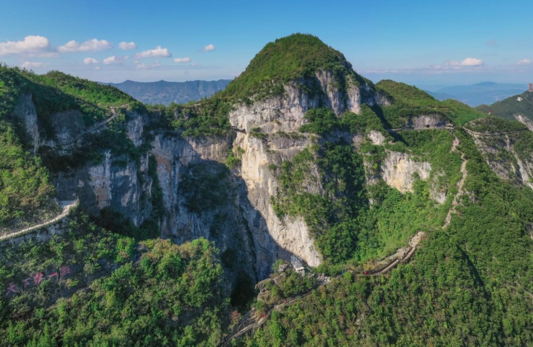 云陽人對龍的崇拜,早已由圖騰崇拜升華為空間營造哲學(xué)。龍脊嶺公園如巨龍飲江般縱貫全城,設(shè)計師巧妙利用自然山脊的曲線,以“龍形地理學(xué)”構(gòu)建城市中軸線。當(dāng)現(xiàn)代交通需要穿越龍脊嶺山脈,三座天橋化作點睛之筆,縣城上環(huán)望江大道則修建飛龍橋,寓意飛龍在天,風(fēng)調(diào)雨順;城市中環(huán)云江大道修建臥龍橋,借用神話“城中有臥龍,萬事借東風(fēng)”的美好寓意;濱江大道修建挽龍橋,表達人們對神龍的挽留,以此來讓山脊景觀損傷減到最低;龍脊嶺上“夔龍望江”的雕塑里東方龍首凝視長江,龍尾卻化作恐龍化石嵌入巖層,構(gòu)成文明對話的完美隱喻;這種“與龍共生”的營造理念,在5A級景區(qū)龍缸天坑達到巔峰——700多米高,世界最長的懸挑玻璃廊橋凌空探出,恰似神龍吐息凝成的云端玉帶;而其核心景區(qū)的龍缸、龍洞,著名景點龍柱、龍傘、龍?zhí)铩埓?、龍罩等更是暗含?dāng)?shù)厝嗣駥υ脐桚埖男叛龊统绨荨?/p>