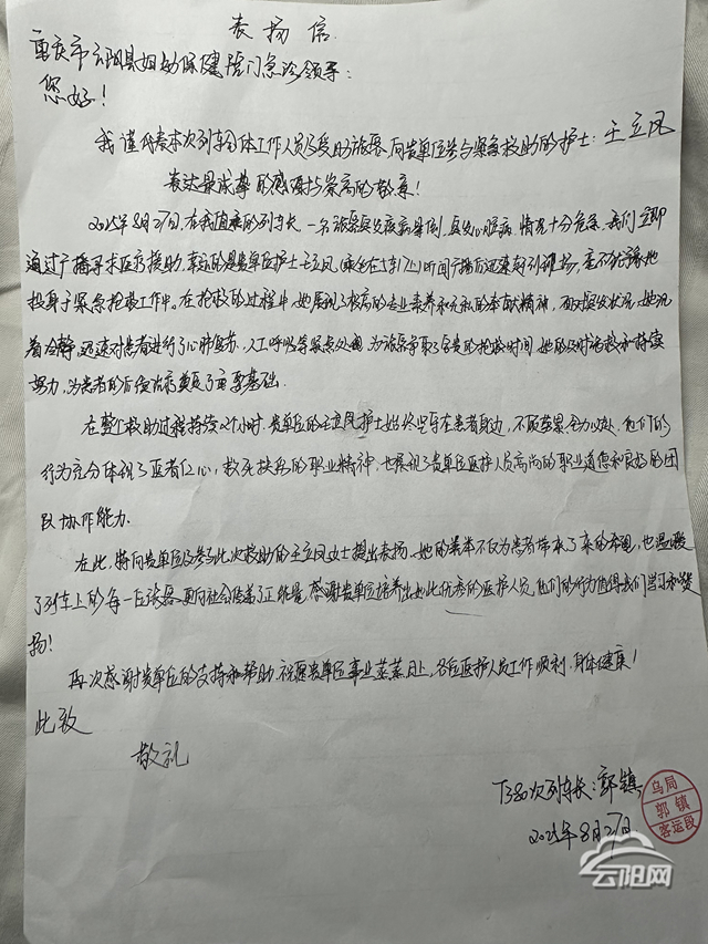 云陽網(wǎng)訊(記者 吳迎花 實習(xí)生 徐菁)“各位乘客,現(xiàn)在車上有旅客突發(fā)疾病暈倒,急需專業(yè)醫(yī)務(wù)人員診斷和治療……”8月27日,云陽縣婦幼保健院的護(hù)士王立鳳在行駛于烏魯木齊至重慶西線路的T380次列車上上演了一場跨越車廂的生命接力。