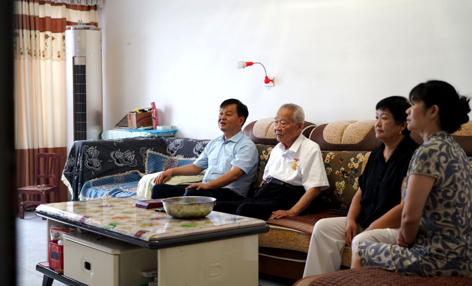 現(xiàn)年102歲的抗戰(zhàn)老同志陳治界和家屬一同觀看閱兵式