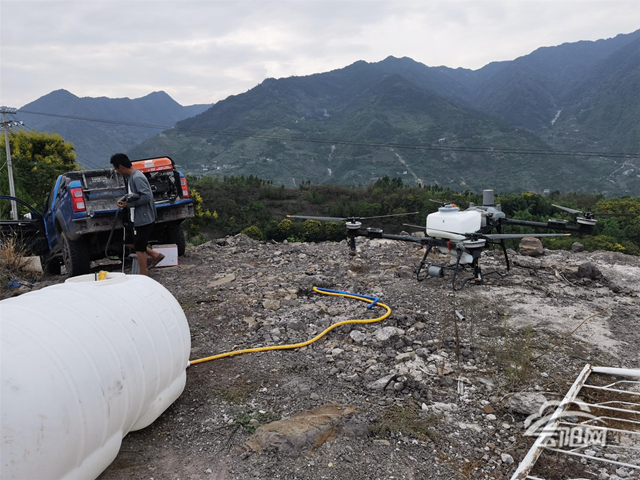 在龍洞鎮(zhèn)金道村,伴隨著一陣陣螺旋槳的嗡鳴聲,無(wú)人機(jī)在技術(shù)人員的操控下,沿著柑橘園勻速飛行,霧狀的農(nóng)藥隨著氣流均勻地散落在園中,不一會(huì)兒,一大片柑橘苗木的病蟲(chóng)害防治作業(yè)就噴灑完成了?!耙郧拔覀兇蜣r(nóng)藥一畝地要三個(gè)小時(shí),現(xiàn)在這個(gè)無(wú)人機(jī)幾分鐘就打完了,非常地方便、高效?!饼埗存?zhèn)金道村黨支部書(shū)記吳慧說(shuō)道。