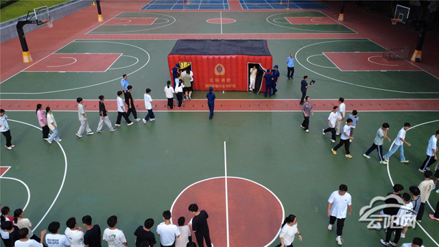 隨著火災(zāi)警報(bào)聲的響起,教學(xué)樓內(nèi)瞬間“濃煙彌漫”。各班級(jí)學(xué)生在老師的引導(dǎo)下,迅速捂住口鼻、彎腰低姿沿指定疏散路線向操場(chǎng)安全區(qū)域撤離,整個(gè)疏散過(guò)程緊張而有序。