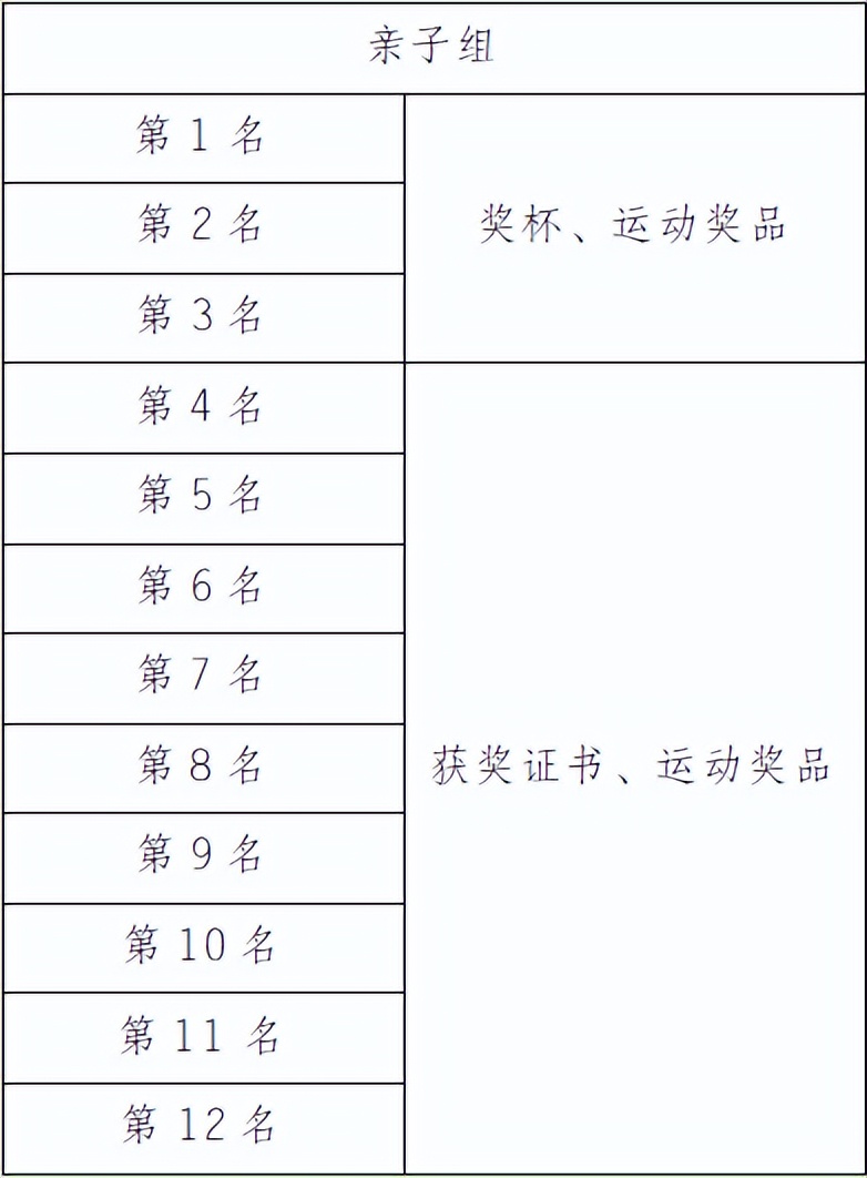 親子組成績(jī)以槍聲成績(jī)錄取前三名,其余名次按凈計(jì)時(shí)錄取。親子組最終成績(jī)以該組最后一名選手越過終點(diǎn)線的為準(zhǔn),該時(shí)間即為本組的完賽時(shí)間。前3名現(xiàn)場(chǎng)安排頒獎(jiǎng)儀式,獎(jiǎng)勵(lì)見下表: