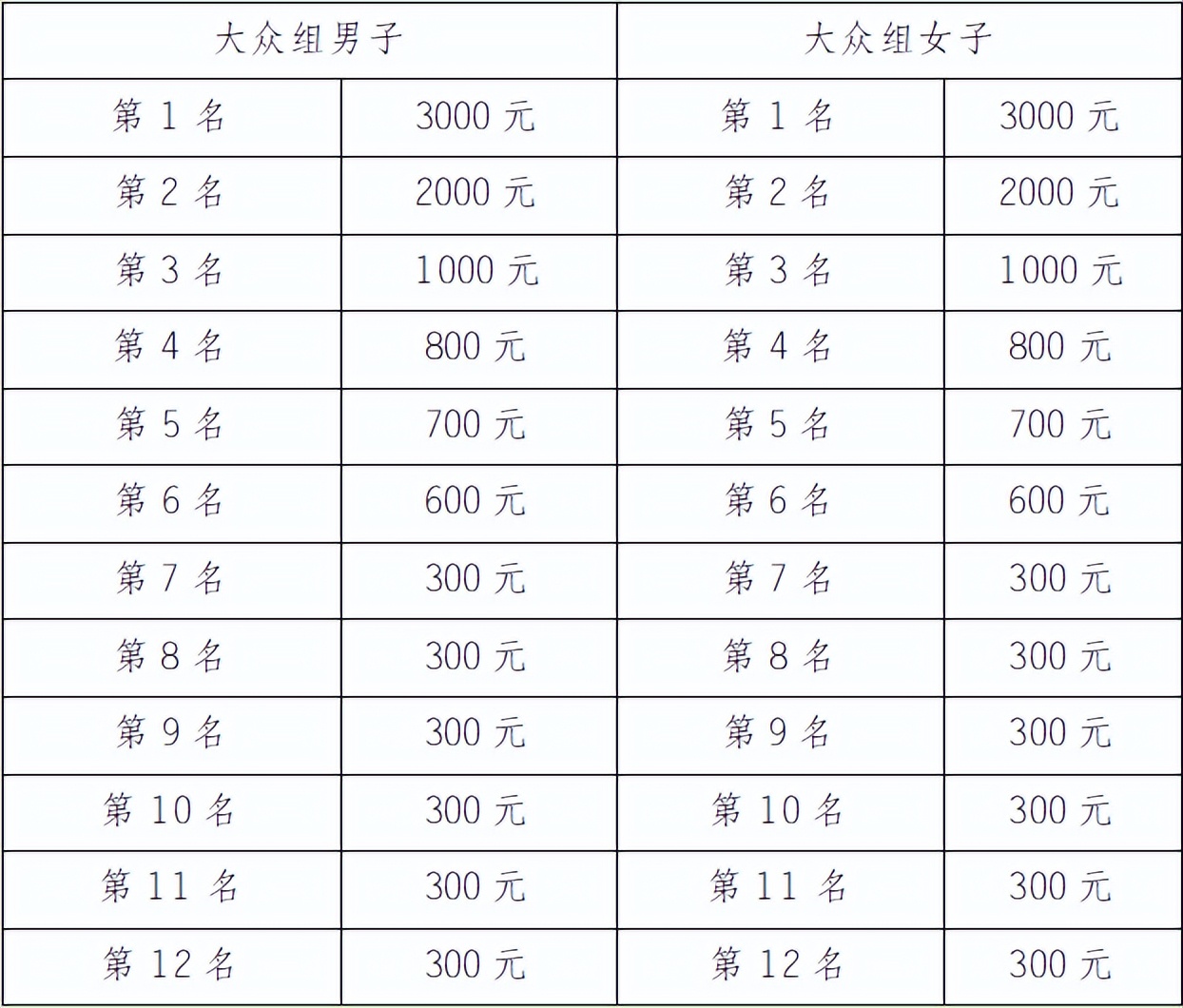 大眾組成績(jī)以槍聲成績(jī)錄取男/女前三名,其余名次按凈計(jì)時(shí)錄取,男、女前三名安排頒獎(jiǎng)儀式。獎(jiǎng)金見下表(單位:人民幣/元):