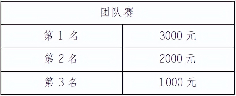 需滿足團(tuán)隊(duì)賽最低人數(shù)要求的團(tuán)隊(duì)才可參與該獎(jiǎng)項(xiàng)排名。取凈成績(jī)最好的4名男子選手、2名女子選手成績(jī)和作為團(tuán)隊(duì)成績(jī)。按團(tuán)隊(duì)成績(jī)錄取前三名,如果對(duì)應(yīng)名次團(tuán)隊(duì)運(yùn)動(dòng)員發(fā)現(xiàn)違規(guī),取消團(tuán)隊(duì)名次,后面名次不遞增?,F(xiàn)場(chǎng)安排頒獎(jiǎng)儀式,獎(jiǎng)金見下表(單位:人民幣/元):